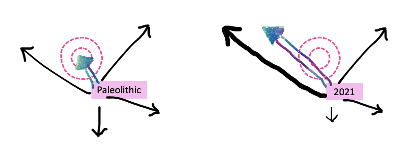 The left hand picture shows us in the paleolithic. We have a bunch of different desires, the black arrows. Each desire is triggered more or less by the environment. Cold triggers us to want warmth. Heat triggers us to run into the shade. Given the paleolithic environment in total, if you add up the effects of all those desires, you take actions – represented by the cosmic rainbow arrow, which adds up the vectors from all the black arrows. You end up in the sweet spot, doing about as well as you can for a hunter-gatherer. That’s not a coincidence, it’s because evolution fixes our desires to get us to the sweet spot, in terms of fitness.